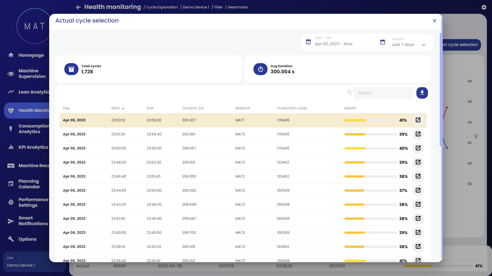 Subsection that allows you to view and analyze the trend of individual variables within a single cycle with the same logic as the subsection of the module. For each cycle under examination, the relative health status is indicated in percentage.