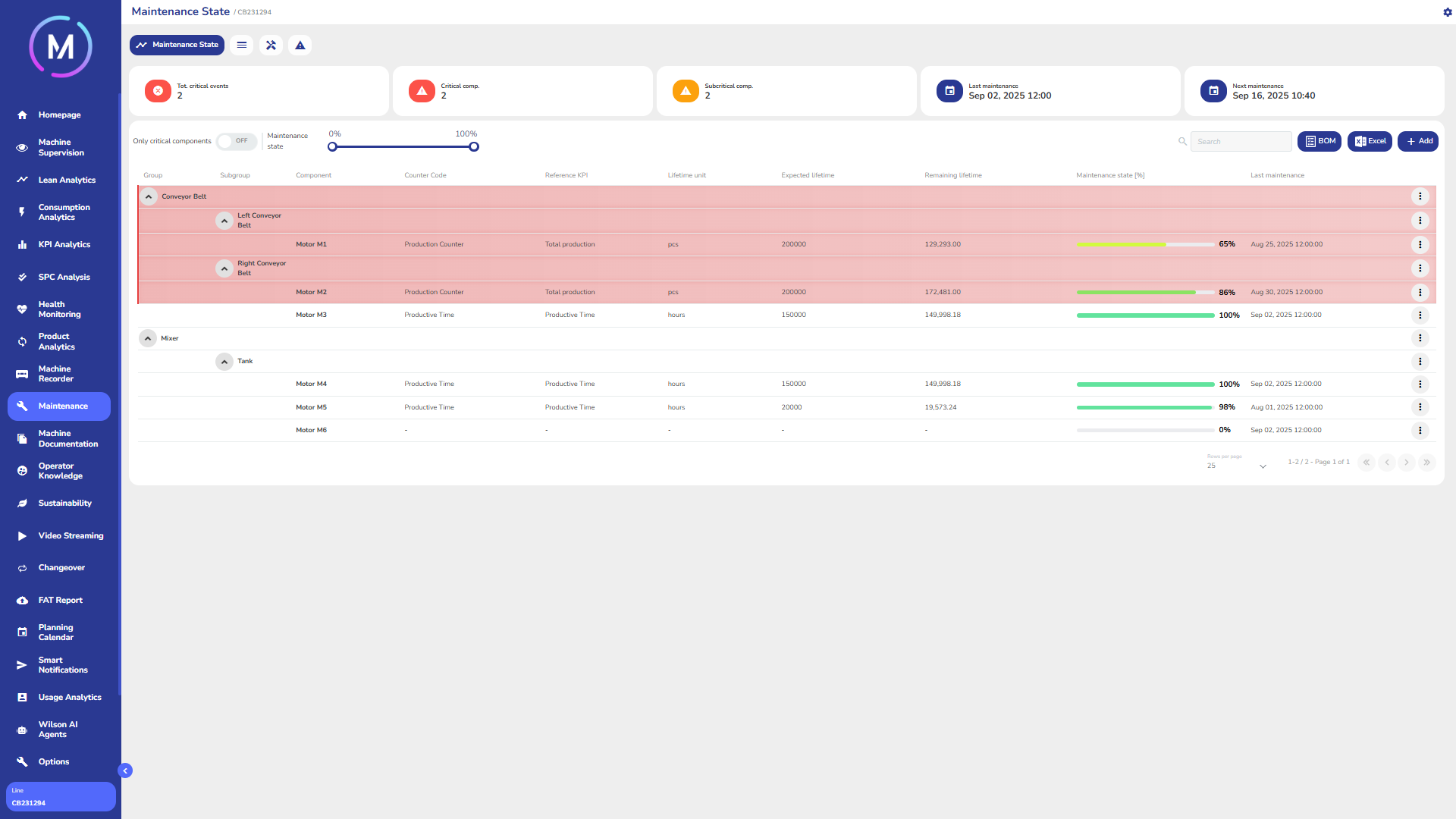 The Maintenance State section can be used to register all the components that make up the machine. For each of them, specific information is displayed and their maintenance status is tracked.