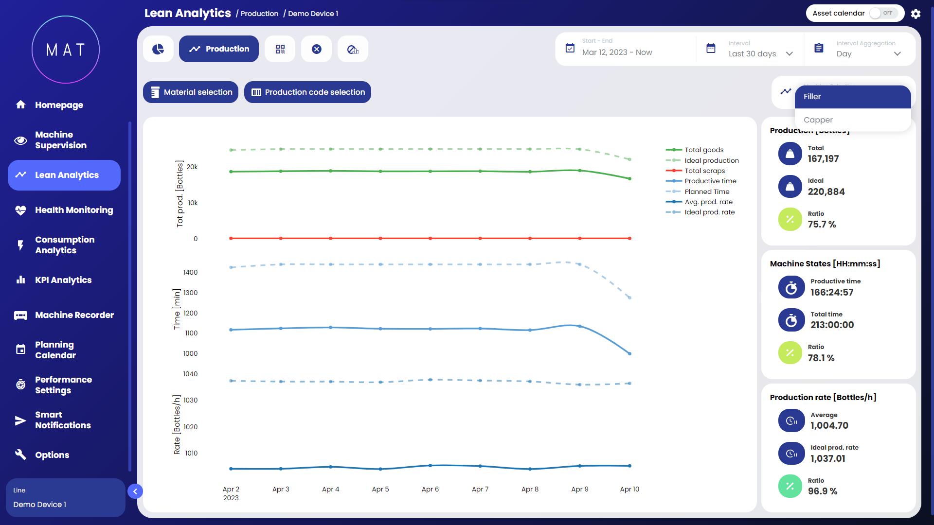 For each production KPI shown in the graph, in the cards on the right side of the dashboard, their average values and total values are calculated as a function of time period chosen by the user.