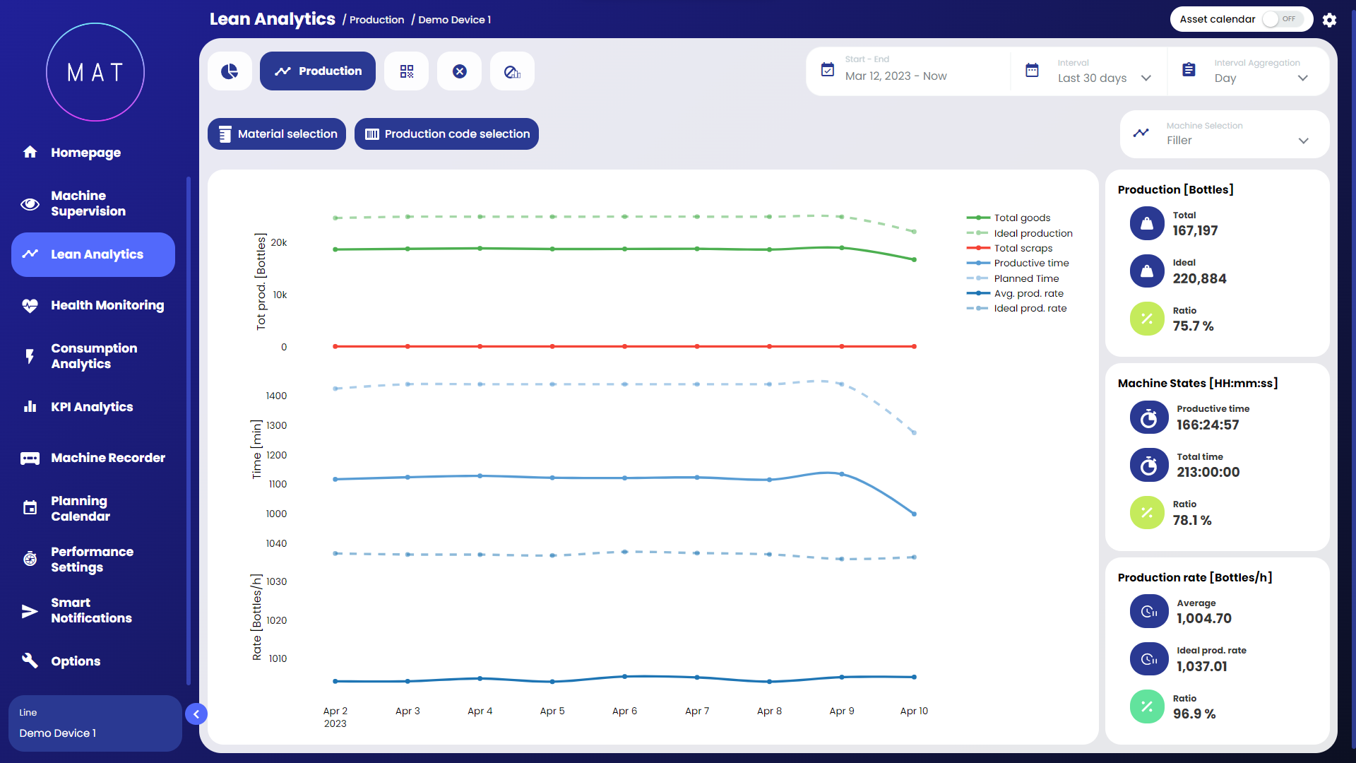The page is dominated by graphs representing the change in key production KPIs over time, where dotted lines represent their ideality: the further the solid lines are from the dashed lines, the worse the production efficiency.