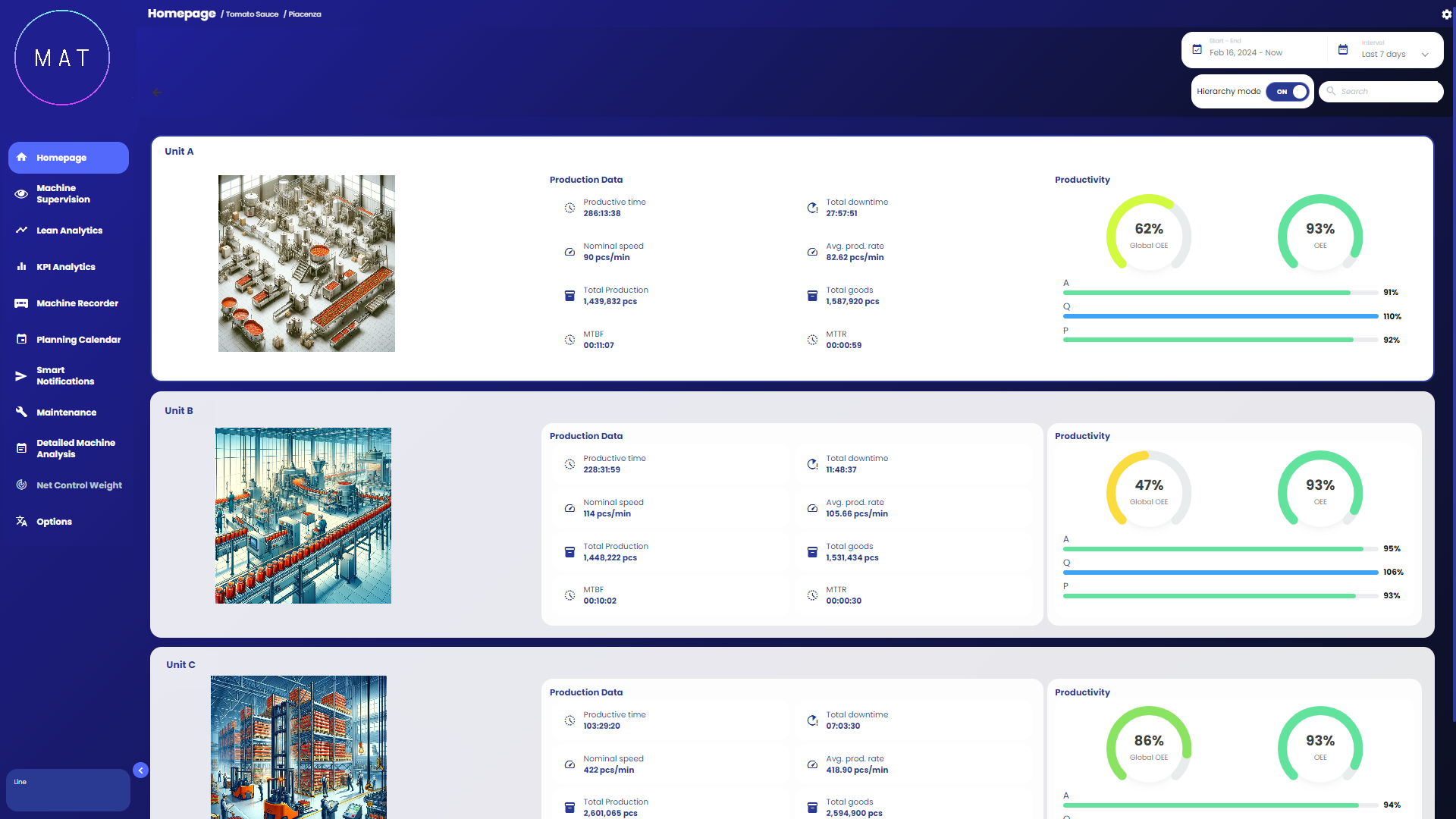 In Image C.1, the view upon opening the web app is displayed. It was decided to divide the machines by type of product manufactured, in this case we have three types: tomato sauce, fruit jam, and vegetable sauce.