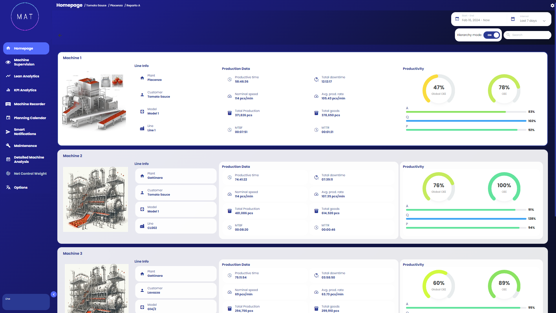 In this view (Image A.1), a card is displayed for each machine. In addition to the image and some general information about the plant and the owner, various KPIs are presented to describe the machine's production. The current state of the plant is also indicated in each card. There is the possibility of adding a chart to each card (Image A.2).