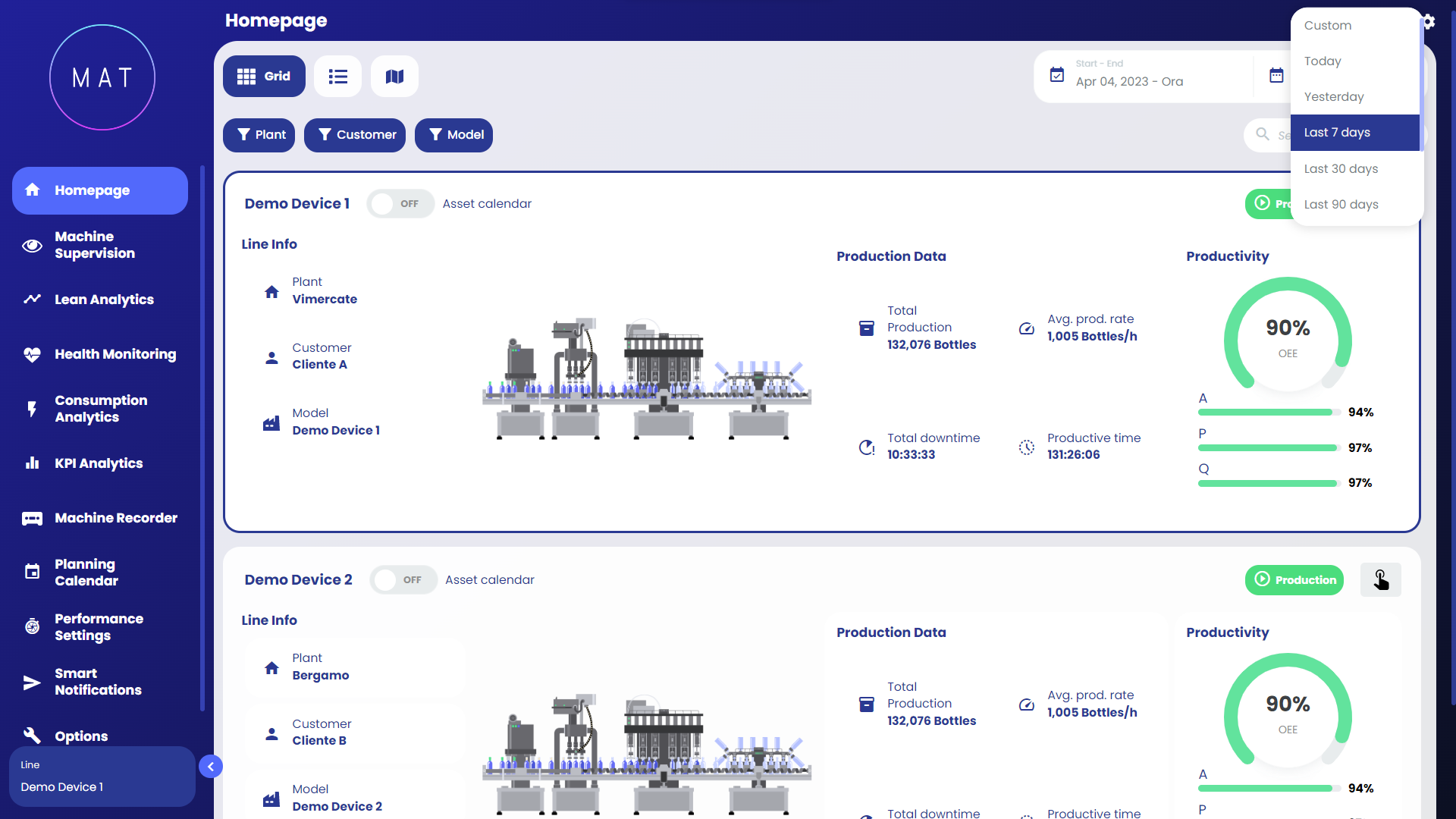 Selecting a specific time period for analysis: By choosing a particular time frame, the summary information presented in the cards will automatically update accordingly. This feature enables quick access to a summary of machine/line behavior over a week, a month, or any desired time range.