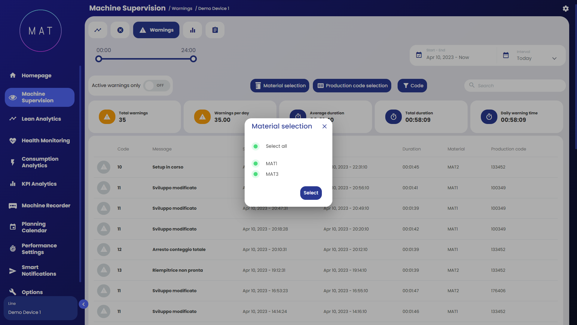 This subsection shows a table displaying all alerts that are currently active and/or have occurred within the selected time period.