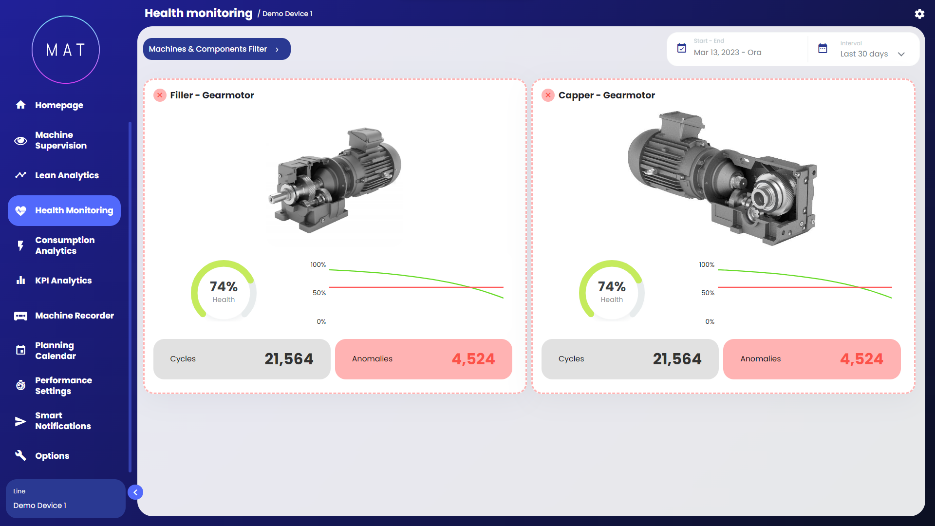 The Health Monitoring module aims to automatically recognize anomalous behaviors of machine components/stations and production lines through a software that uses machine learning algorithms to process data and evaluate their conditions.